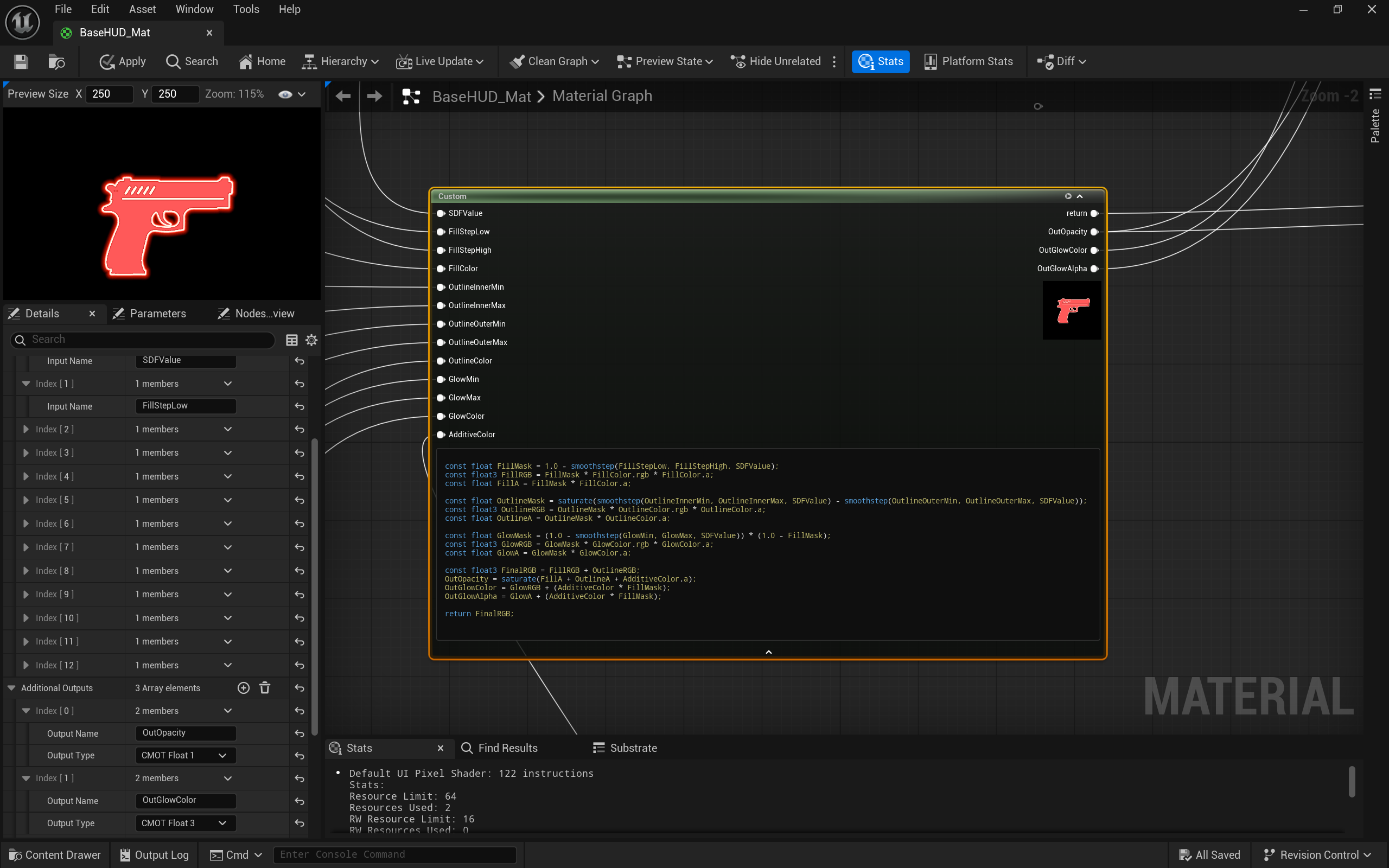 const float OutlineMask = saturate(smoothstep(OutlineInnerMin, OutlineInnerMax, SDFValue) – smoothstep(OutlineOuterMin, OutlineOuterMax, SDFValue));